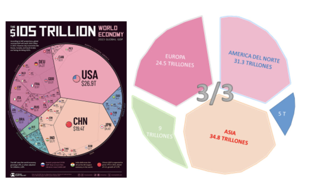 Se podría hablar de una economía mundial a tres tercios, donde participan América del Norte, China y Europa. De los 105 trillones producidos por la economía mundial 80 son generados en 15 países: cuatro americanos, cuatro asiáticos, cinco europeos, completando los quince: Rusia y Australia.