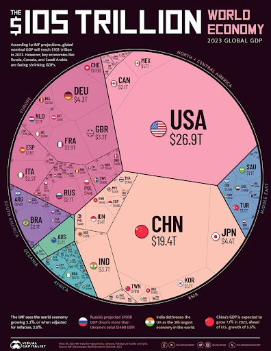 Para finales de 2023, se espera que la economía mundial tenga un producto interno bruto (PIB) de 105 trillones de dólares, o 5 trillones de dólares más que el año anterior, según las últimas proyecciones del Fondo Monetario Internacional (FMI) de su Perspectivas de la Economía Mundial 2023.