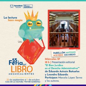 En Casa Terán se llevará a cabo el taller “Empatía, cuidado animal y medio ambiente” (infantil) a las 16:30 horas. En tanto que, en el Pabellón Antonio Acevedo Escobedo, la conferencia “Fundación de la Biblioteca Enrique Fernández Ledesma”, a cargo de Patricia Guajardo Garza, a las 17:00 horas. Para continuar con las actividades, la presentación editorial El Bien Jurídico en el Derecho Administrativo de Eduardo Astrain Bañuelos y Leandro Eduardo a las 18:00 horas; por último, la presentación de la revista Íntegrus, de la Secretaría Ejecutiva del Sistema Estatal Anticorrupción de Aguascalientes, a las 19:00 horas.