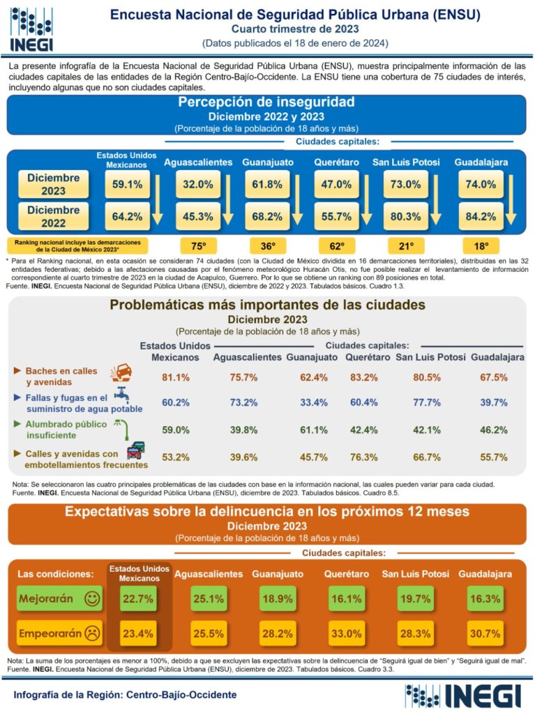 En diciembre de 2023, 64.8 % de las mujeres y 52.3 % de los hombres consideraron que vivir en su ciudad es inseguro. Las ciudades con mayor porcentaje de personas de 18 años y más que consideraron que vivir en su ciudad es inseguro fueron: Fresnillo, con 96.4 %; Naucalpan de Juárez, con 91.0 %; Uruapan, con 89.9 %; Ecatepec de Morelos, con 88.7 %; Zacatecas, con 87.6 %; y Cuernavaca, con 85.7 por ciento. En contraste, las ciudades donde la percepción de inseguridad resultó menor fueron: Benito Juárez, con 15.2 %; Puerto Vallarta, con 19.4 %; Piedras Negras, con 20.5 %; Mérida, con 22.2 %; La Paz, con 22.4 % y Los Cabos, con 23.2 por ciento.
