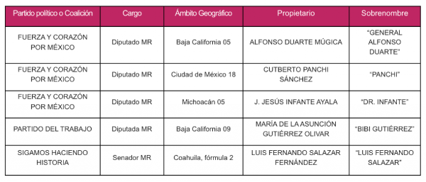De igual forma, el Consejo General del INE aprobó los sobrenombres de candidaturas, considerando que la denominación con la que se le conoce públicamente a una persona candidata no puede sustituir o eliminar el nombre y apellidos de la misma; por lo que el sobrenombre debe incluirse después de dichos elementos. Lo anterior, conforme a lo siguiente: