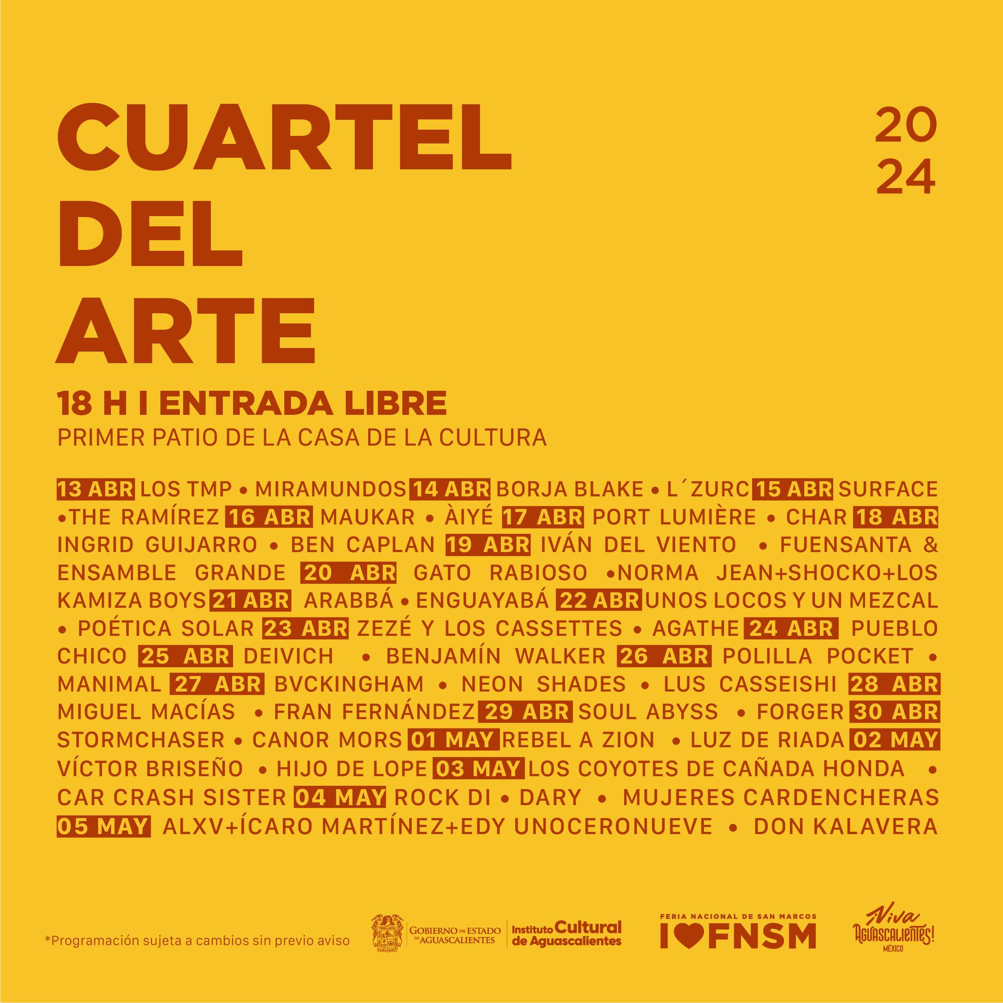 Como cada año, el Instituto Cultural de Aguascalientes anuncia el cartel oficial que confirmará los espectáculos presentados en el Cuartel del Arte, para la edición 2024 de la Feria Nacional de San Marcos, el cual da oportunidad a bandas locales y nacionales para presentarse en este importante escenario.