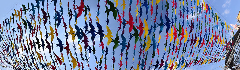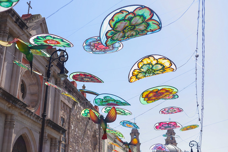 Para esta edición de la Feria Nacional de San Marcos 2024, la calle Venustiano Carranza pasó a ser decorada con la temática de‘Cielo Tejido’, bordado que está inspirado en las flores del tocado de La Catrina con colores de los atardeceres de Aguascalientes que se pueden apreciar a diario.