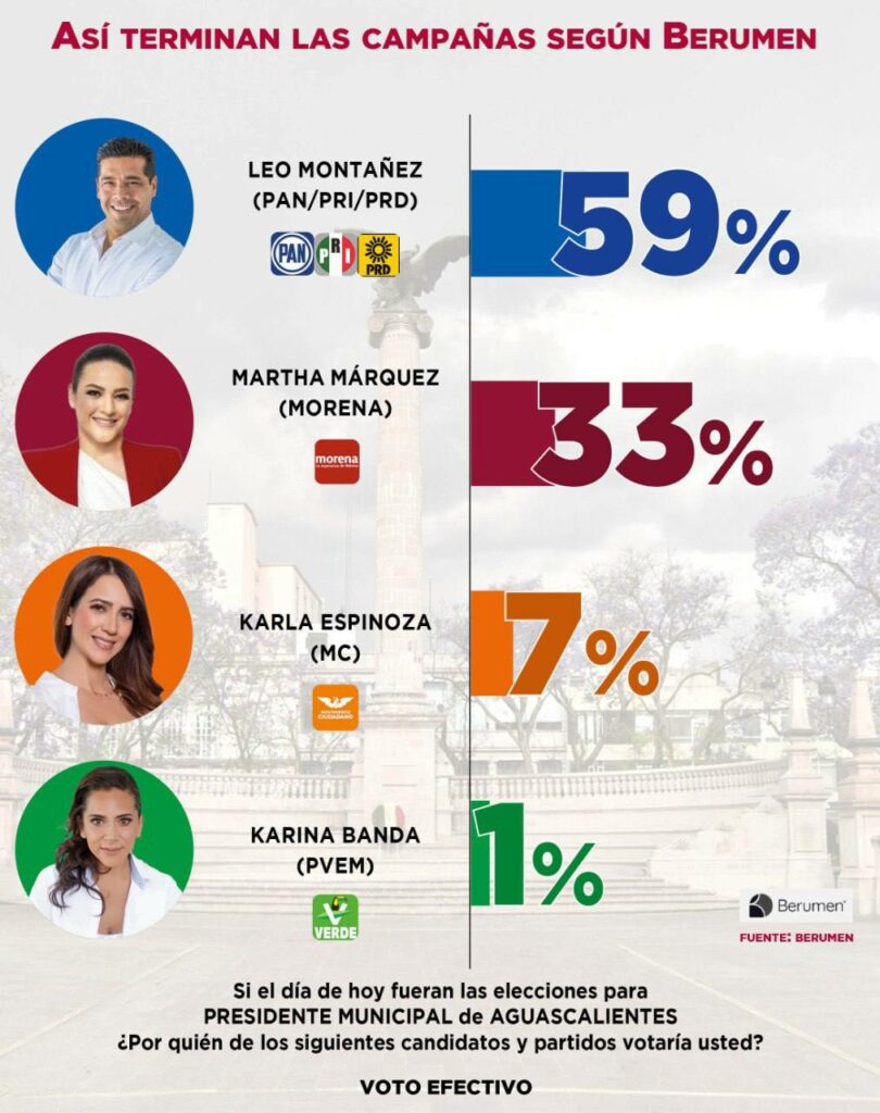 Respondiendo a la pregunta “Si el día de hoy fueran las elecciones para presidente municipal de Aguascalientes. ¿Por quién de los siguientes candidatos votaría usted?”, de acuerdo con Berumen el candidato de la Coalición Fuerza y Corazón por Aguascalientes integrado por PAN, PRI, PRD, Leonardo Montañez se coloca a la cabeza de la campaña con 59%.