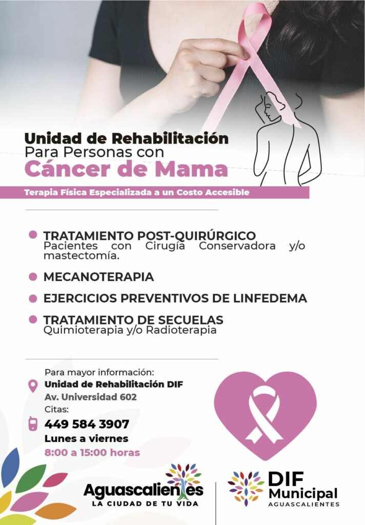 El Departamento de Servicios Médicos del Sistema para el Desarrollo Integral de la Familia (DIF) municipal de Aguascalientes pone a disposición de la población en general la Unidad de Rehabilitación para Personas con Cáncer de Mama, en donde se atiende a pacientes con secuelas de mastectomía, quimioterapia o radioterapia, así lo informó Zayra Angélica Rosales Tirado, directora general de esta institución.