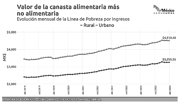 México Cómo Vamos nos hace ver que el valor de la canasta alimentaria y no alimentaria ha mostrado consistentemente incrementos anuales mayores a la inflación, por ejemplo, en abril tuvo un crecimiento de 5.7% anual, mientras que en ese periodo la inflación general fue de 4.65%. El valor de la canasta básica alimentaria en abril fue de 2,299 pesos y la suma con la canasta básica no alimentaria es de 4,510 pesos en zonas urbanas. Lo que la hace inaccesible para la gran mayoría de los hogares mexicanos.