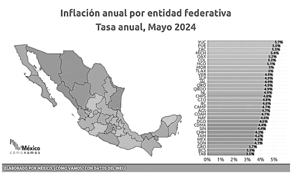 En la región Centro Occidente, las diferencias son destacables: Zacatecas presenta una inflación de 5.5% con Aguascalientes, en 4.7%. Baja California Sur, se encuentra en el 3.5%.