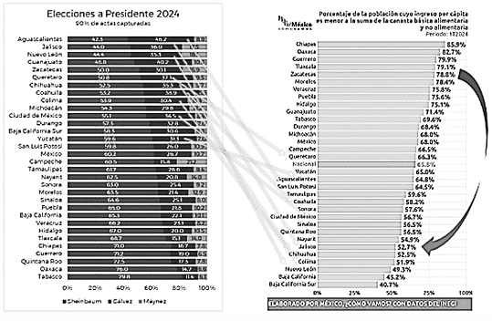 Los estados que votaron un 30% o más por la alianza Fuerza y Corazón por México, son aquellos con menor porcentaje de población cuyos hogares no logran cubrir la canasta alimentaria y no alimentaria. No así las entidades con carencias del 66% o más, que emitieron el voto de la precariedad.