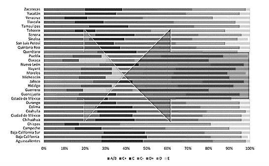 De hecho, la Asociación Mexicana de Agencias de Inteligencia de Mercado y Opinión AMAI, que genera y transforma datos para apoyar la toma de decisiones en México, da a conocer la distribución de los niveles socioeconómicos por estado, donde podemos apreciar que los niveles de clase media o más (C, C+ y A/B) son minoría, y en algunas entidades se encuentran francamente en extinción.