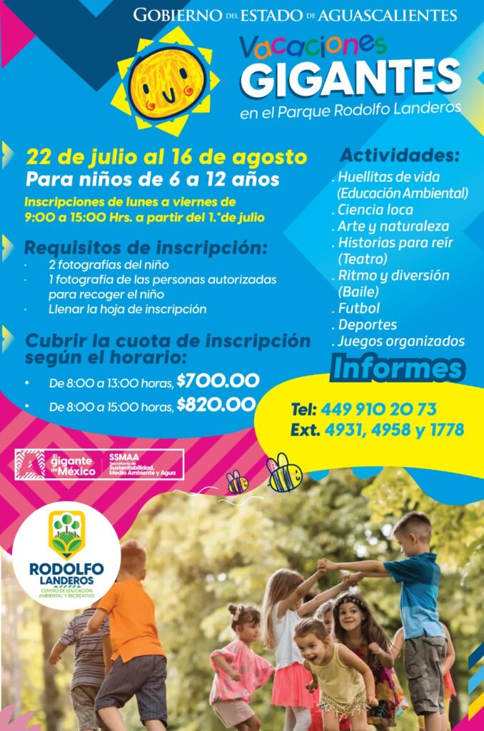 El Gobierno del Estado, a través de la Secretaría de Sustentabilidad, Medio Ambiente y Agua (SSMAA), invita a niñas y niños de entre seis y 12 años de edad a los cursos de verano “Vacaciones Gigantes” que se llevarán a cabo del 22 de julio al 16 de agosto en los parques Rodolfo Landeros Gallegos y El Cedazo; las inscripciones comienzan a partir del 1° de julio.