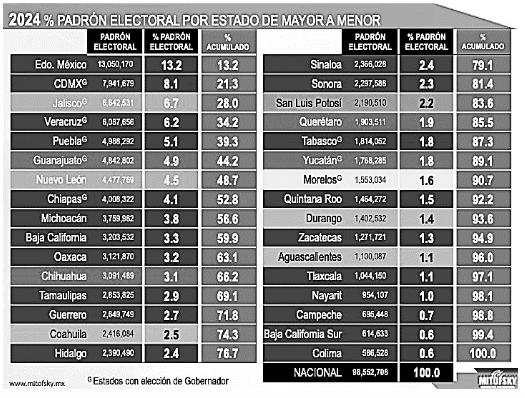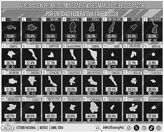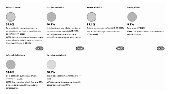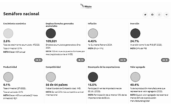 México sólo logra las metas fijadas en: empleos formales generados a enero del 2024 (19 mil 021), el sector del desempeño de las exportaciones y la inversión como porcentaje de participación en el PIB. En amarillo aparecen: el Estado de Derecho, la Deuda Pública y la Informalidad Laboral. Se ubican aún en fase preventiva: el porcentaje de crecimiento económico, y la participación laboral de la PEA. En rojo tenemos: la inflación, la productividad, la competitividad internacional (lugar 56 de 64 países), el valor agregado, pues aún no representa el 50% de la producción manufacturera global; la pobreza laboral muy superior a la meta del 20%, y el acceso al crédito como porcentaje del PIB.