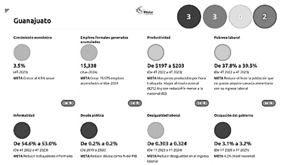 Guanajuato exhibe dos semáforos en color rojo (productividad y pobreza laboral) por tres en verde (informalidad, deuda pública, y ocupación en el gobierno). No mejora el crecimiento económico, los empleos formales generados y su desigualdad laboral.