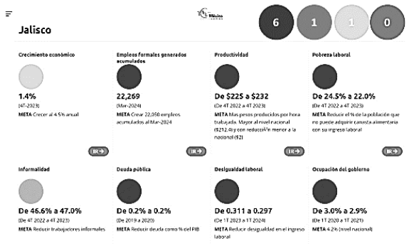 Jalisco logra seis semáforos en verde. Es un estado que dejó de crecer al 5.6%, haciéndolo ahora al 1.4% (cuarto trimestre), alcanza y rebasa los empleos formales propuestos (con 22 mil 269), así como disminuye la deuda pública y la desigualdad laboral. Es considerable el decrecimiento de su pobreza laboral para ponerse prácticamente dentro de la meta, pero su informalidad se incrementó cuando antes estaba en verde.