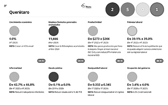 Querétaro se reduce a dos de ocho semáforos en verde por cinco en preventivo y uno rojo. En verde presenta la generación de empleos formales (con 11 mil 666 de 6 mil 450 programados) y la deuda pública; aunque alta, redujo la productividad laboral ($266). Presenta en rojo (como la mayor parte de la región) la pobreza laboral.