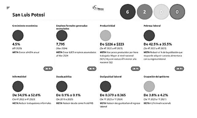 San Luis Potosí muestra seis de los ocho semáforos en verde: reduce la pobreza y la desigualdad laboral, pero reduce la productividad ($223) y presenta en naranja la ocupación en el gobierno. Se encuentra en verde el crecimiento económico y mejora su generación de empleos formales; mantiene verdes por reducir la informalidad y la deuda pública.