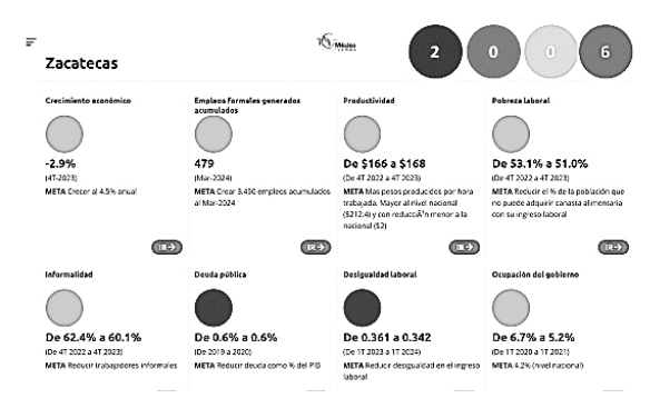 El semáforo de Zacatecas exhibe seis de ocho indicadores en rojo por dos en verde (ha mantenido la deuda pública y reducido la desigualdad laboral). Se encuentra en un contexto de alta pobreza laboral, tiene baja productividad ($168 pesos) y alta informalidad. Hay reducida creación de empleos formales con sobreocupación en el gobierno. Presenta un menos 2.9% de decrecimiento económico en el cuarto trimestre del 2023.
