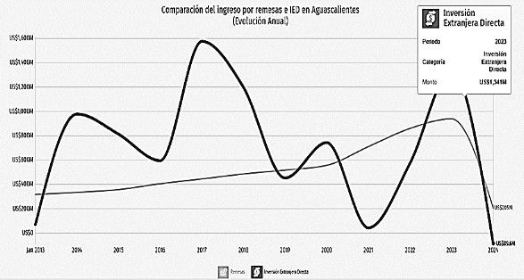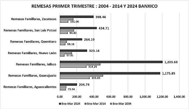 En 20 años las remesas en México y la región prácticamente se han cuadruplicado, pero entre los estados seleccionados han crecido más en Nuevo León (5.58 veces) que en Aguascalientes (2.78 veces) y más en San Luis Potosí (4.58 veces) que en Guanajuato (3.33 veces). El país recibió en el último trimestre enero-marzo del 2024 más de 14 mil millones de pesos en remesas.