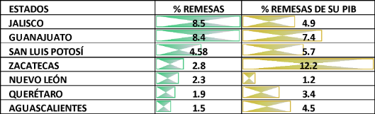 Aguascalientes recibe el 1.5% del total de las remesas nacionales y representan el 4.5% de su PIB; Zacatecas recibe el 2.8% de las mismas pero el monto le significa el 12.2% de su PIB, lo que contrasta con Nuevo León que aun recibiendo 315 millones de dólares durante el primer trimestre del año sólo representen el 1.2% de su PIB.