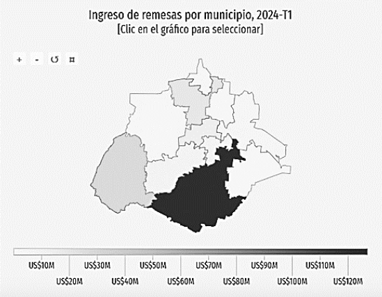 En el primer trimestre de 2024 los municipios de Aguascalientes con mayores ingresos por remesas fueron Aguascalientes (US$127M), Calvillo (US$27.7M) y Rincón de Romos (US$19M), sumando el 85% del monto recibido.