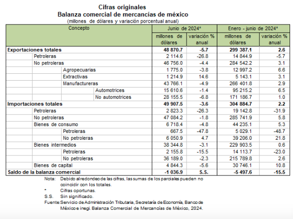 En los primeros 6 meses de 2024, la balanza comercial presentó un déficit de 5 498 millones de dólares. En el mismo periodo de 2023, el déficit fue de 6 505 millones de dólares.
