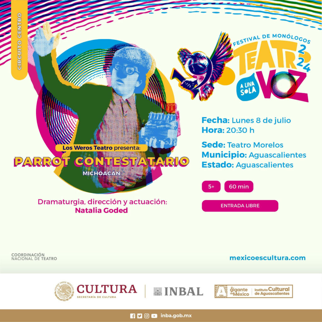 Este lunes 8 de julio en el Teatro Morelos a las 20:30 horas se presentará Parrot Contestatario con Los Weros Teatro, de Michoacán. Parrot Contestatario, un clown filósofo entrañable que nos recuerda lo necesario que es reír, hacerse preguntas e imaginar mundos distintos. Recomendada para niñas y niños de 8 años en adelante. La obra tiene una duración de 60 minutos. La entrada es libre.