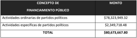 Por lo anterior, sumando ambos conceptos, el financiamiento público a otorgar a los partidos políticos durante el próximo año asciende a $80,673,667.80 pesos.