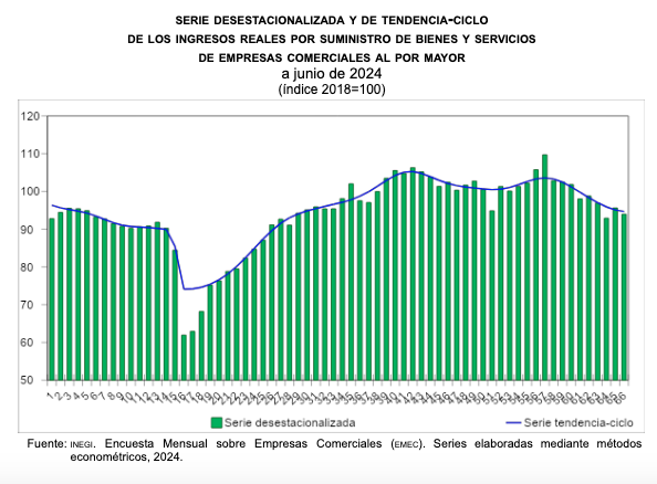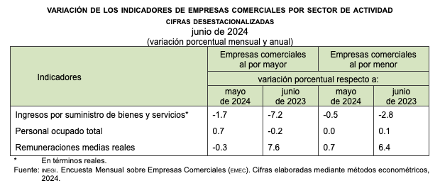 En junio de 2024, a tasa mensual y con cifras desestacionalizadas, en las empresas comerciales al por mayor, los ingresos reales por suministro de bienes y servicios cayeron 1.7 % y las remuneraciones medias reales, 0.3 por ciento. El personal ocupado total aumentó 0.7 por ciento.