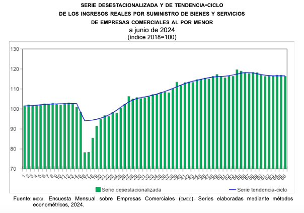 En el sexto mes de 2024 y a tasa anual, los datos desestacionalizados del comercio al por mayor se comportaron de la siguiente manera: los ingresos reales por suministro de bienes y servicios disminuyeron 7.2 % y el personal ocupado total, 0.2 por ciento. Las remuneraciones medias reales pagadas subieron 7.6 por ciento.