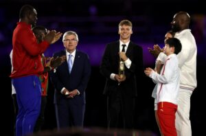 Para concluir, el ahora apodado “Rey León” al nadador francés, Leon Marchand, tomó la llama olímpica para hacer el protocolo y dar por concluidos estos Juegos junto con los representantes de cada continente.