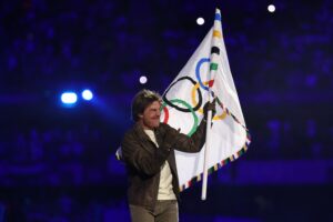Para seguir con el evento, el Stade de France, entonó el Himno Olímpico en griego para que la Bandera Olímpica cambiara de manos. Escuchando el himno nacional de Estados Unidos como nueva sede de los próximos Juegos Olímpicos y de la mano de Tom Cruise, es como se transportó la Bandera a Los Ángeles.