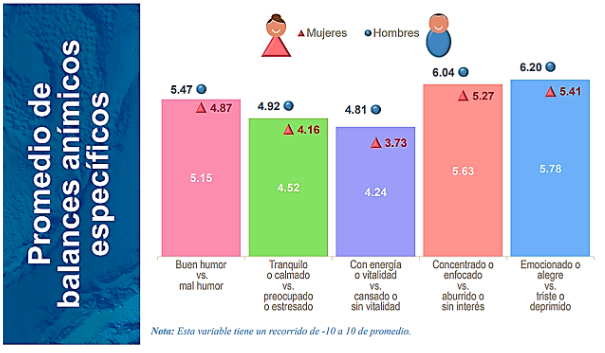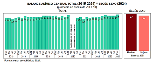 El indicador de balance anímico general de la población, medido por el BIARE (Bienestar Auto Reportado) de INEGI, se construye con base en los estados de ánimo que las personas experimentaron el día anterior a la entrevista. En el primer trimestre del 2024, el balance anímico de la población adulta tuvo un valor positivo de 6.6. Entre hombres y mujeres hay una brecha en el balance anímico: el nivel promedio de los hombres es mayor que el de las mujeres, 6.7 y 6.4, respectivamente.