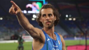Gianmarco Tamberi, atleta del salto de altura se deja crecer la barba durante las rondas eliminatorias y aparece con la mitad de ella rasurada para la final de la competencia.