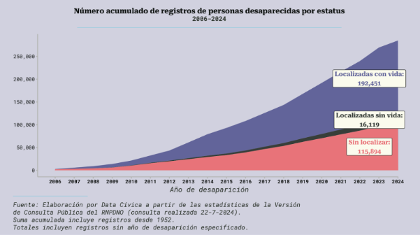 Aunque han existido desapariciones en periodos previos, desde 2006, con el inicio de la llamada Guerra contra las drogas, el número de personas desaparecidas ha aumentado de manera alarmante, así como el número de fosas clandestinas a lo largo del territorio nacional. Según el Registro Nacional de Personas Desaparecidas y No Localizadas (RNPDNO), al 22 de julio de 2024 se han registrado 324,464 personas desaparecidas desde 1952. De estas personas, 192,451 fueron localizadas con vida, 16,119 sin vida y 115,894 siguen sin ser localizadas, aunque colectivos de familiares y organizaciones de la sociedad civil sostienen que esta cifra es mucho mayor.