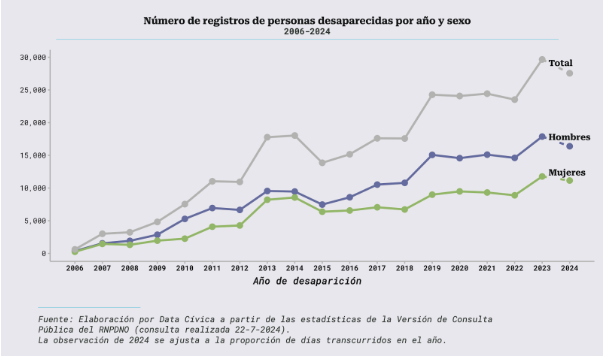 A pesar de estos hallazgos, Data Cívica sostiene que el Registro Nacional de Personas Desaparecidas y No Localizadas (RNPDNO) no nos permite hablar precisamente de cuántas son ni de todas las personas desaparecidas que hay en el país, sino más bien de las personas que han registrado como tal. Para que una persona desaparecida sea contabilizada en el RNPDNO debe ser reportada y posteriormente registrada por las autoridades, lo cual no siempre ocurre por miedo a denunciar, desconfianza en las autoridades o negligencia.