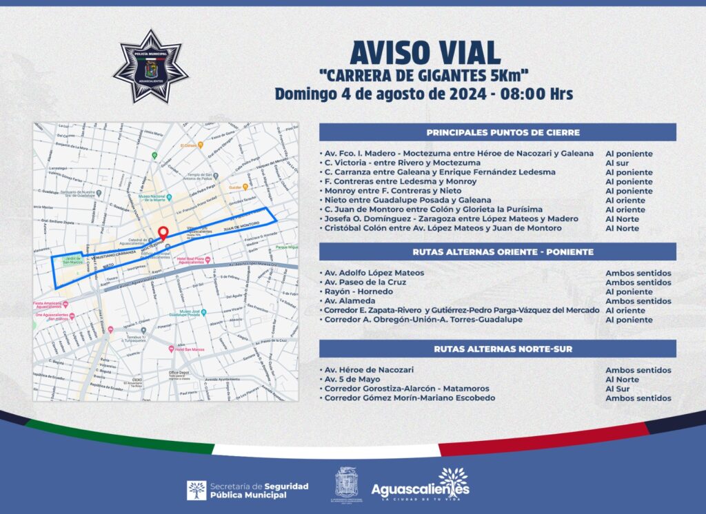 La Policía Vial de Aguascalientes de la Secretaría de Seguridad Pública Municipal de Aguascalientes (SSPM), tiene listo el operativo para la “Carrera de Gigantes 5KM”, que se llevará a cabo el próximo domingo 4 de agosto en punto de las 08:00 horas.
