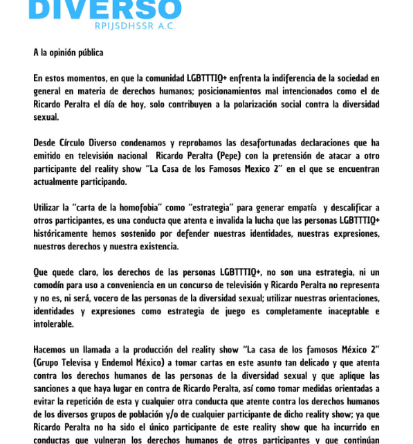 Victor Rivas, representante legal de Circuito Diverso (colectivo a favor de la comunidad LGBT+), mostró su total desacuerdo con las acciones de Ricardo y exigió una disculpa pública: “En algún momento se autonombró como activista y vocero de la comunidad, y con esto queda claro que él utiliza este sector para sus fines personales”.