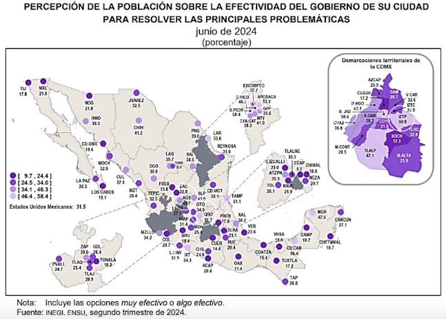 A nivel nacional, el 31.5 % de la población de 18 años y más consideró que el gobierno de su ciudad era muy o algo efectivo para resolver los problemas más importantes. Las áreas urbanas (ciudades) de interés donde más se lo percibió así, fueron: San Pedro Garza García, con 58.4 %; Ciudad del Carmen, con 56.4 % y Nuevo Laredo, con 55.6 por ciento. Las áreas urbanas (ciudades) donde menos, fueron: Ecatepec de Morelos, con 9.7 %; Oaxaca de Juárez, con 11.4 % y Cuernavaca, con 14.4 por ciento.