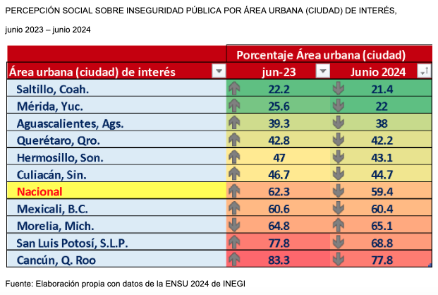 De acuerdo con la Encuesta Nacional de Seguridad Pública Urbana (ENSU) del INEGI, aplicada durante el segundo trimestre del 2024, a nivel nacional, en junio de 2024, seis de cada diez habitantes de 18 años y más consideró inseguro vivir en su ciudad; el 65.1 % de las mujeres y 52.4 % de los hombres así respondió. Las ciudades con mayor porcentaje de población que se sintió insegura fueron: Fresnillo (94.7 %), Naucalpan de Juárez (89.2 %), Uruapan (86.8 %), Irapuato (84.8 %), Tapachula (84.7 %) y Zacatecas (84.7 %). En contraste, las áreas urbanas donde la percepción de inseguridad resultó menor fueron: San Pedro Garza García (11.7 %), Piedras Negras (14.3 %), Los Cabos (16.7 %), Los Mochis (18.7 %), Benito Juárez (18.9 %) y Saltillo (21.4 %).