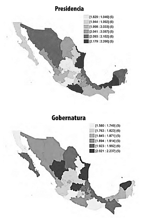 Estas variables corresponden a la pregunta: “En su opinión, ¿con qué frecuencia cree que ocurren prácticas de corrupción en…?”, y que se respondió en una escala del 1 al 4, donde: 1 significa Muy frecuente; 2, Frecuente; 3, Poco frecuente; 4, Nada; y 9, el encuestado no sabe o no respondió. La región centro norte de México es la que más aprecia corrupción en Presidencia y algunos estados del norte, junto con Guanajuato y Yucatán los que menor corrupción aprecian de sus gubernaturas.