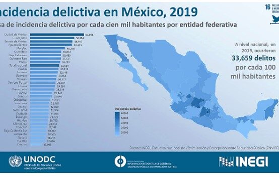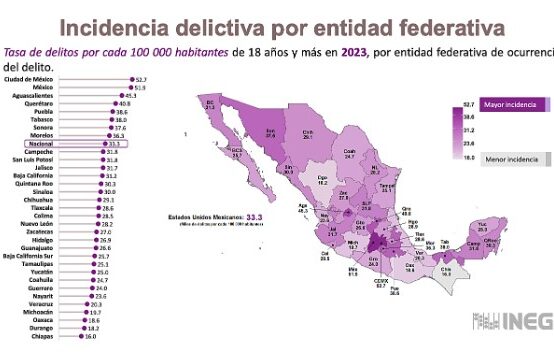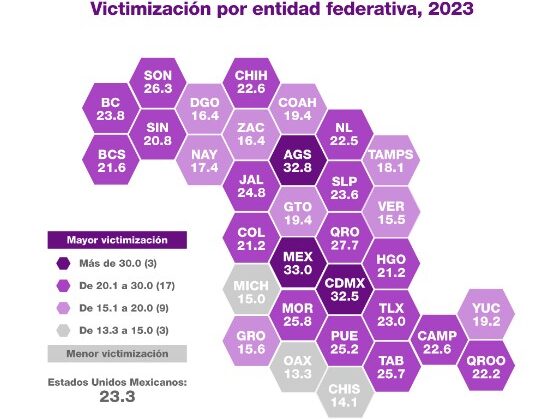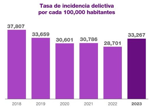 En 2023, el número de delitos se estimó en 31.3 millones: la tasa fue de 33 mil 267 delitos por cada 100 mil habitantes, lo que superó las cifras de 2022. Lo anterior representa una tasa promedio de 1.4 delitos por víctima, tasa mayor a la de 2022. En 2023, las entidades con las tasas más altas fueron Ciudad de México, con 52 723; estado de México, con 51 881, y Aguascalientes, con 45 mil 262 por cada 100 mil habitantes (en 2019 traía 48,443).