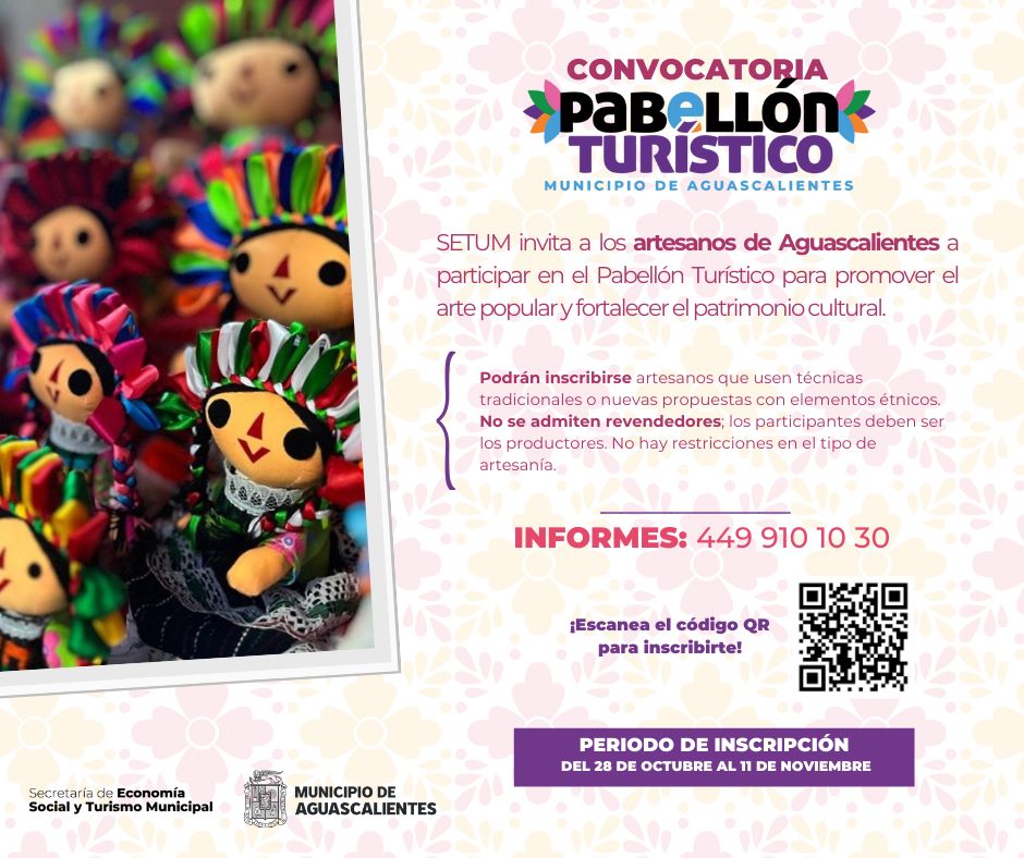El Pabellón Turístico se llevará a cabo en los portales del Palacio Municipal todos los fines de semana, de 12:00 a 21:00 horas. El evento es gratuito para los participantes, quienes serán convocados conforme a la lista de registro, con un cupo de 22 artesanos por cada fin de semana. La frecuencia de participación dependerá del número de inscritos.