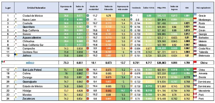 América Latina y el Caribe es una región estancada y con bajo capital humano que se encuentra en franco deterioro respecto al año anterior; su promedio retrocede en 4 de los 12 componentes del IPS: específicamente en Nutrición y Cuidados Médicos (8 países); Información y Comunicaciones (17 países); Salud (14 países); y Derechos y Voz (8 países). México se encuentra en el lugar 54/170. Aguascalientes calificaría en el lugar 34 junto con Grecia; Guerrero calificaría en el lugar 100 junto a Bangladesh.