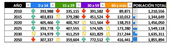 Del 2015 al 2050, ganaremos 300 mil adultos mayores y perderemos 100 mil infantes menores de 14 años, el reto será conformar familias sostenibles en espacios construidos y habitados a escala humana, resolviendo las cuatro necesidades básicas de: ingreso, espacio, tiempo y afecto, sin las cuales las familias no perviven. Las estrategias para encontrar un equilibrio intergeneracional, en la sociedad y en los hogares, serán la clave para lograr beneficios compartidos entre chicos y grandes.