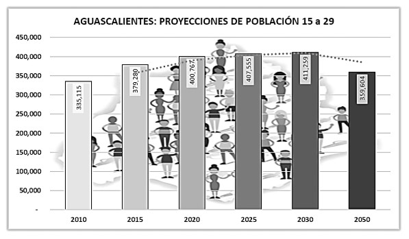 El grupo de 15 a 29 años, considerado como el compuesto por adolescentes y jóvenes, tendrá su máxima participación en el 2030 con más de 411 mil efectivos juveniles; dicha suma prácticamente se irá perdiendo paulatinamente hasta llegar a 50 mil habitantes entre el 2030 y el 2050.