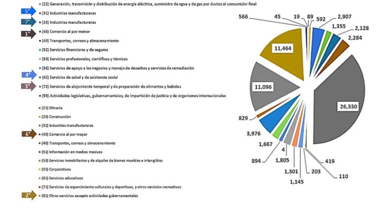 De los 71 mil 228 negocios censados por INEGI en Aguascalientes, 26 mil 330 corresponden a comercios al por menor; 11 mil 096 a servicios de alojamiento temporal y de preparación de alimentos y bebidas y 11 mil 464 a otros servicios excepto servicios gubernamentales; 3 mil 976 corresponden a servicios de salud y de asistencia social; 5 mil 035 a industrias manufactureras y 2 mil 284 son comercios al por mayor. Ocho de cada diez unidades económicas de Aguascalientes pertenecen a estas seis clasificaciones.