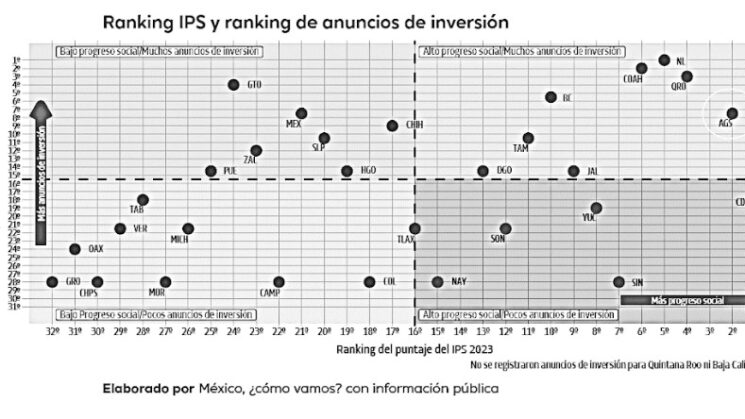 A decir de los voceros de México Cómo Vamos, este año, la novedad del reporte consiste en dar a conocer que las entidades con mayor IPS concuerdan con aquellas donde se han dado a conocer más anuncios de inversión, y en su mayoría cuentan con gobiernos opositores a la 4T.