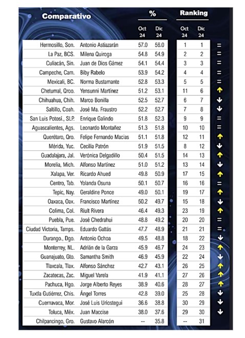 Como líder, entre los alcaldes de las grandes ciudades mexicanas, se encuentra Cruz Pérez de Ciudad Juárez Chihuahua con 56.2% de aprobación. Junto con Hermosillo y Culiacán, los alcaldes mejor evaluados de las capitales de los estados son peninsulares tanto en el norte como en el sur de México, con una aceptación superior al 53%. En el vecindario regional destacan los alcaldes de San Luis Potosí, Aguascalientes, Querétaro y Guadalajara, con acuerdos superiores al 51% (considerando las grandes ciudades aparecería también la alcaldesa de León con 52%). Entre los diez últimos de la tabla tenemos a Durango, Monterrey, la capital de Guanajuato y Zacatecas.