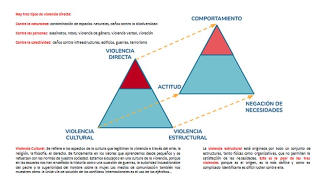 El triángulo de la violencia es un concepto introducido por Johan Galtung, sociólogo y matemático noruego, para representar la dinámica de la generación de la violencia en conflictos sociales. Según Galtung, la violencia es como un iceberg, de modo que la violencia visible es solo una pequeña parte del conflicto.