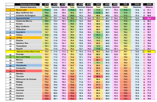 Esperanza de vida al nacer por estados, series 2010 a 2025