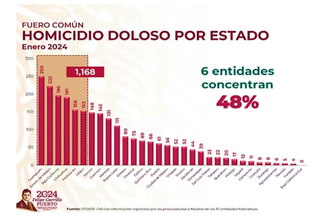 En el caso de México, son seis los estados que concentran prácticamente la mitad de los homicidios dolosos; se trata de Guanajuato, Estado de México, Baja California, Chihuahua, Michoacán y Jalisco.